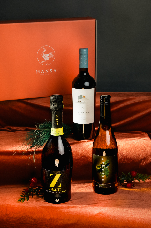 A hamper featuring the items below, thoughtfully arranged in a Hansa cardboard gift box.